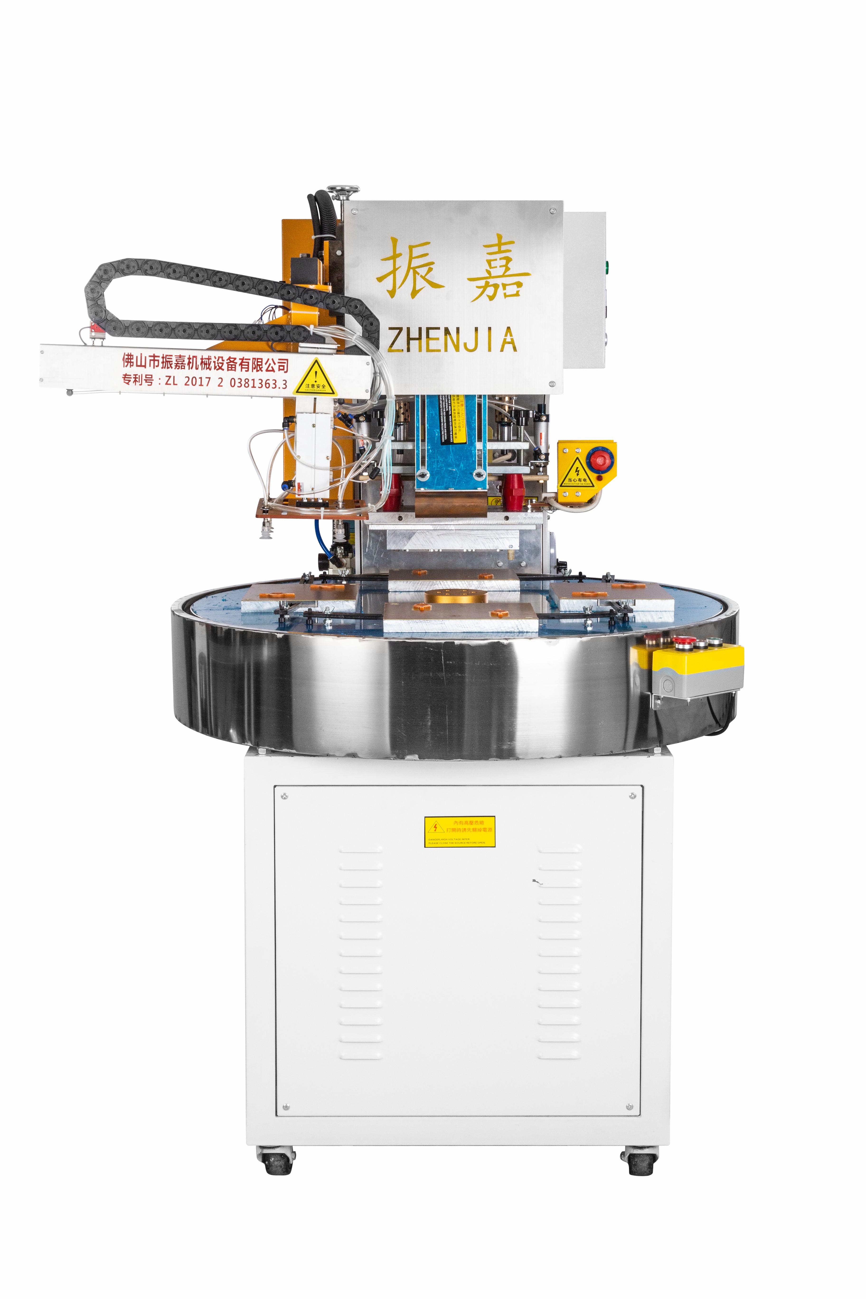 全自動圓盤高周波機(jī)設(shè)備型號為ZJ-8K-ADRB3,此機(jī)由振嘉高周波機(jī)械廠家專業(yè)生產(chǎn),此機(jī)器質(zhì)量已通過ISO機(jī)器質(zhì)量認(rèn)證;我司對客戶的樣板提供免費(fèi)打板打樣,傳授產(chǎn)品生產(chǎn)整過程工序及提供生產(chǎn)方案。全自動圓盤高周波機(jī)設(shè)備 以圓盤360度旋轉(zhuǎn),分為三個工作位,即每120度為一個工作位。圓盤裝有數(shù)字化變頻器,通過帶動電機(jī)控制圓盤轉(zhuǎn)動速度,數(shù)字化顯示可調(diào)節(jié), 并配有PLC觸摸屏控制,簡單易懂,高效節(jié)能。