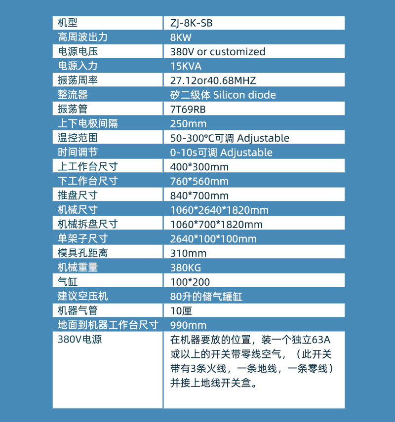 單頭推盤式高周波機(jī)型號(hào)為ZJ-8K-SB,這款機(jī)器裝有進(jìn)口雙管防火花保護(hù)裝置,對(duì)高周波模具及生產(chǎn)產(chǎn)品起到很大的保護(hù)作用,可以把模具打火機(jī)率降低95%,是一款推盤式高周波機(jī),可以單人操作,節(jié)約人工。機(jī)器由振嘉機(jī)械設(shè)備有限公司高周波生產(chǎn)廠家專業(yè)制造,機(jī)器質(zhì)量已通過歐盟CE質(zhì)量出口檢測(cè)和ISO9001機(jī)器質(zhì)量檢測(cè);